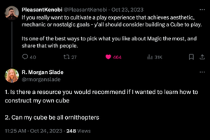 On October 23, 2023, Vincent Chandler (PleasantKenobi) made a post on Twitter promoting the play experience of Cube. This was responded to by the user R. Morgan Slade, who asked, "Can my cube be all ornithopters"? While this tweet appears to have been meant to be taken flippantly, it prompted Andy Mangold to spend some time putting together a prototype list, which he posted in a reply to Slade on October 25, 2023. Mangold hadn't intended to go any further with 100 Ornithopters than it being a response to a joke comment. However, the list had come to the attention of users in the CubeCon Discord server who decided to run a simulated draft of the cube. Initial feedback was positive, and prompted Mangold to return to the project to start making changing based on suggestions from this playtest.