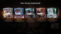 Five preconstructed monocolored Account Mastery decks became available on Magic Arena from March 2019[1][2], replacing the earlier New Player Experience Decks. They consisted of cards and themes from set available on the platform up to Ravnica Allegiance.
