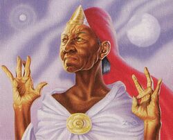 Ancestor debuted as a creature type in Mirage on the card Auspicious Ancestor which appears as an older human wearing a robe that was able to grant life. The type was later dropped in the Grand Creature Type Update, and it was given errata to be a Human Cleric.[1] It has never been reprinted with its new type line as it is on the Reserved List. The Auspicious Ancestor grants life when it dies or allows for paying of one colorless mana when a white spell is cast to gain 1 life as well. These are likely why it became a cleric.
