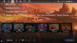 With the release of Avatar: The Last Airbender onto Arena in November 2025 six new Story decks were added, unannounced, to the deck tab.[1] Unlike previous story deck releases, with the exception of the inaugural Lord of the Rings Story decks, there wasn't an associated phantom or Midweek Magic event. The content of the decks needed to be crafted as they included the full art variant of the basic lands and, at the time of their release, Avatar: The Last Airbender wasn't available on Arena to purchase.