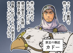 Cado is a knight from Castle Ardenvale, and was the trusted right-hand man of High King Algenus Kenrith.[1] He has short black hair and a scar over one eye.