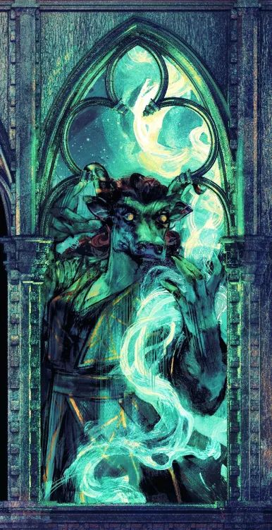 Jamira on the back cover of Omens of Chaos, as illustrated by Corey Brickley