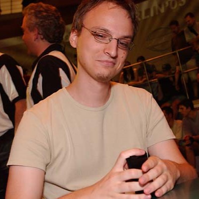 Saša Zorc during his Round 16 feature match against Kai Budde at 2003 World Championships. Both players needed at least 2 wins from their final 3 matches to earn a Top 8 spot. Photo from official online event coverage.[1]