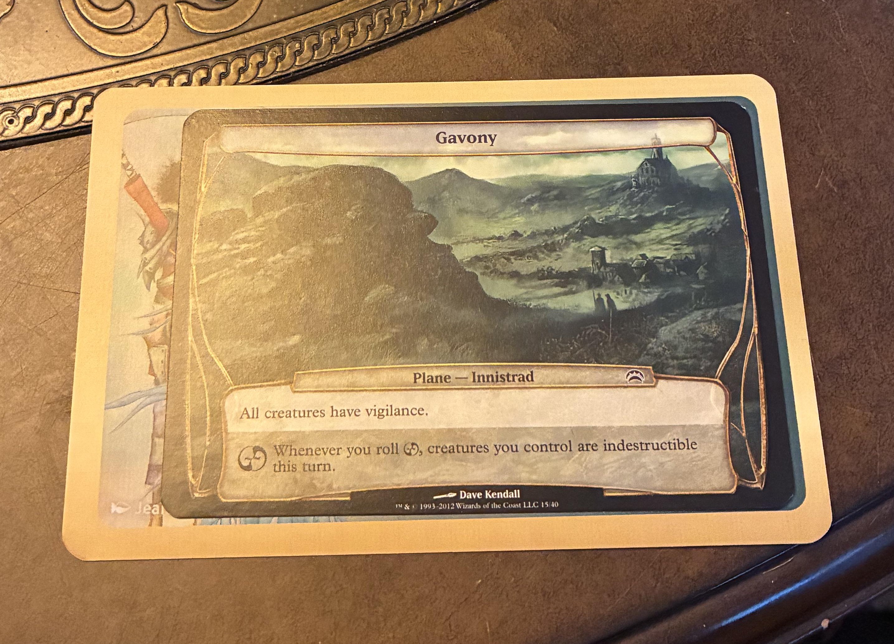 Size comparison of a Secret Lair Spectacular plane (Imaginary Friends) and a regular plane card (Gavony).