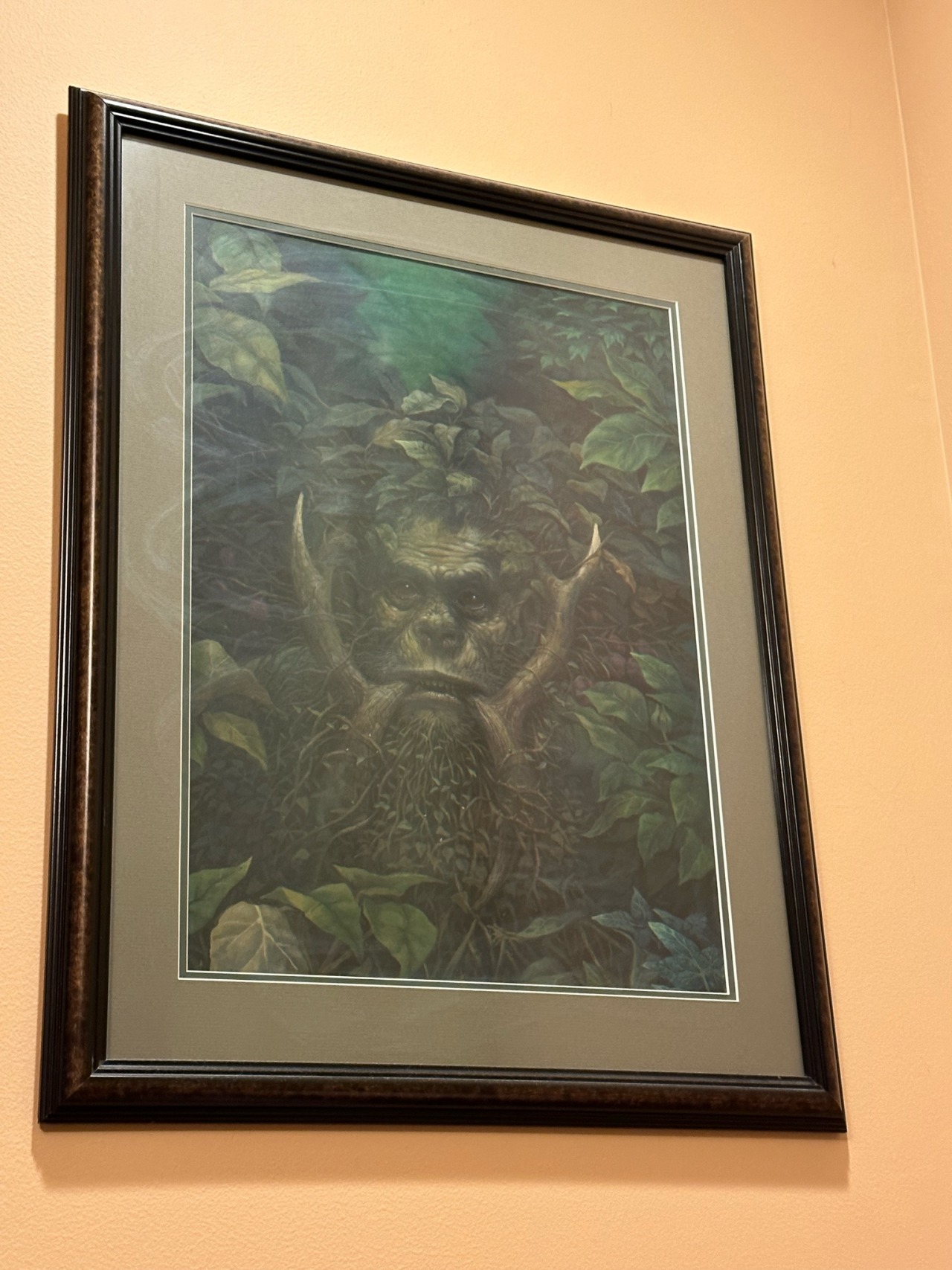 The original painting The Green Man by artist Stuart Griffin. Seen hanging in the house of Mark Rosewater, who purchased the painting after its usage on his namesake card, Maro.