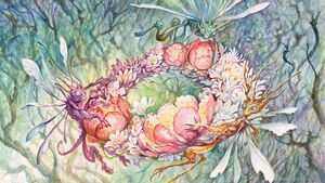 Forty years after Oona's defeat, Maralen had begun to flower as she physically adapted to her enthronement, reminding her of her tether to her creator. Her reflection, Maralen believed, began to hold Oona's omnipresent gaze, full of menace and ire.[10] She started to fear that the magical flaw that had allowed for her self-awareness was beginning to wane. Maralen believed these occurrences to be signifiers of Oona's reemergence; a reemergence that would end in Maralen's death at the hands of Rhys, whom she entrusted years ago to take her own life if ever Oona threatened to return. These worries, however, were brought about and exacerbated by the malevolent tricks played on Maralen by her resentful brother, Oko, who returned to the plane and hoped to deal a further deathblow to Oona. Oko had long-since sworn off his birthright to rule Shadowmoor and now lived as a Planeswalker. He had mistaken Maralen for Oona reborn and was unaware that she was staunchly opposed to being overtaken by their mother. The siblings, rejoined for the first time in decades, reconciled in the presence of Eirdu and Isilu as they maintained the balance that Oona had once fought so hard to unspool.[11]