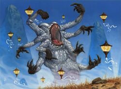 The kami's appearance is that of a giant white beast, with eight arms ending in black, clawed hands. Its face is dominated by its giant muzzle, and large lanterns float around its head. It is known to eat Kitsune as offerings.[1]