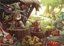 Porringer was the ancestral home of the ash treefolk, and used to be a peaceful stronghold for a large community of ashfolk shamans and warriors who tolerated the presence of other tribes so long as they did not harm the trees.[2] Many boggarts and outcast elves whom sought refuge resided in the valley as well, taking advantage of the ashfolks' protection. The boggarts were known to sneak amid groves of treefolk to make trouble and steal "souvenirs" of their trespasses.[3] The valley was also the location of the Feast of Footbottom, which was a peaceful gathering held by the local boggart colonies where they reveled with other warrens and shared stories.