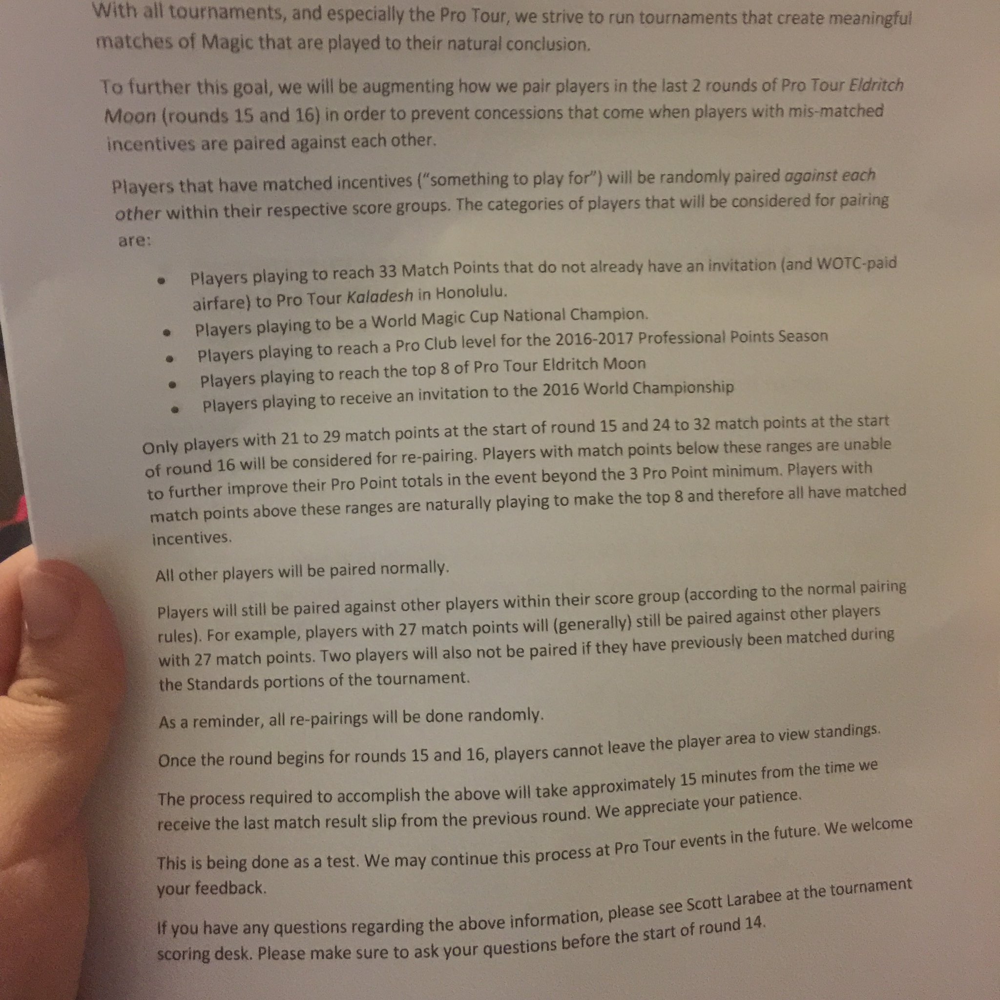Rounds 15 and 16 of Pro Tour Eldritch Moon were paired semi-randomly based on incentives for each player. Players whose goal was a top eight berth at the event were more likely to be paired against each other; the same was true for players hunting Pro Players Club levels, Worlds or World Magic Cup slots, or invitations to the next Pro Tour. The purpose of this change was to prevent concessions that happen as a result of players with mis-matched incentives being paired against each other.[1]