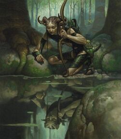 On Lorwyn, where the measure of an elf's beauty determined their placement in society, Rhys belonged to the immaculate caste. His Lorwyn self was a model representative of Gilt-Leaf ideals. He lived as a hunter and upheld the strict values of his elvish fiefdom, placing beauty, cunning, and duty above all else. An accident that he caused destroyed his horns, however, and his left horn was broken off into a jagged, irregular spike two inches above his forehead, while his right became a charred, blackened stump ending halfway up its height.[1] His disfigurement caused an immediate crisis of identity, and Rhys considered himself cursed by his own hand and unworthy to call himself a leader, hunter, or even an elf any longer.