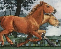 The Tarpan was last seen to have lived during the Ice Age of Dominaria. They appear as slightly more furry brown horses, making them more adapted to colder climates. General Jarkeld was said to state that a good Tarpan will serve its rider, faithful and true, while a bad one will kick them in the head.[2] It is not known if they survived the Thaw.